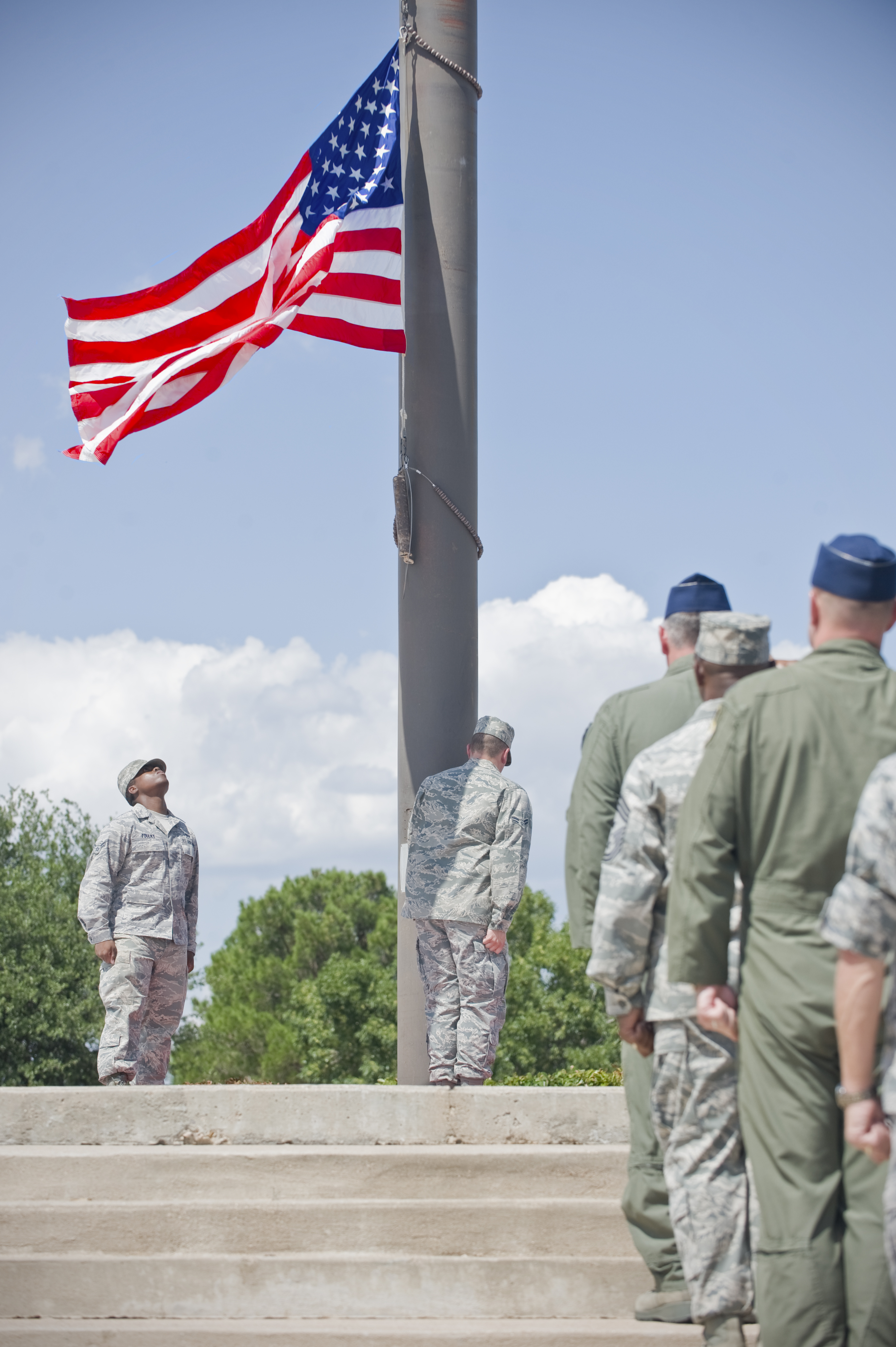 Dyess leadership render a salute as the American flag is lowered during a wing retreat ceremony July 13, 2012, at Dyess Air Force Base, Texas. A retreat ceremony signifies the end of a duty day and is also a way to pay tribute to the American flag. (U.S. Air Force photo by Airman 1st Class Jonathan Stefanko/ Released)