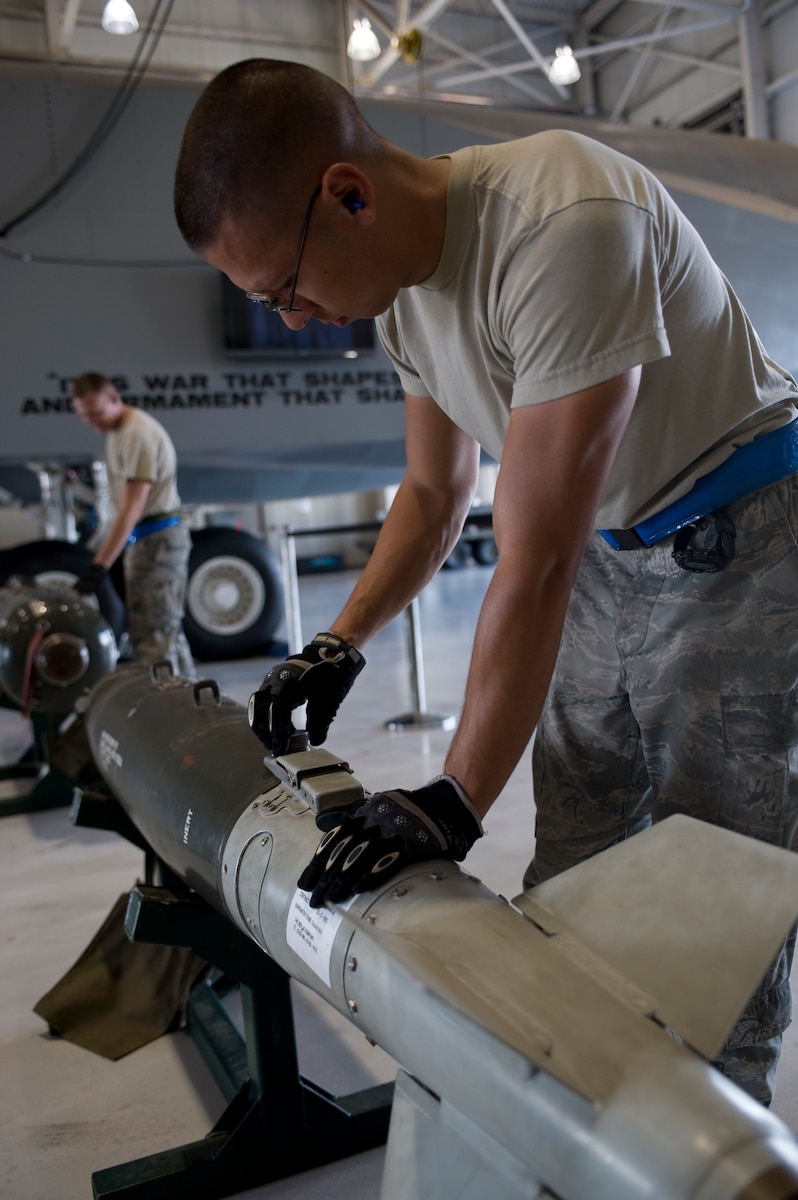 U.S. Air Force Tech. Sgt. Anthony Tucker, left, and Senior Airman John Smith, 7th Aircraft Maintenance Squadron weapons load crew team members, inspect a composite tool kit during the Weapons Load Crew of the Quarter competition held at the load crew training facility June 28, 2012, at Dyess Air Force Base, Texas. The competition was comprised of a dress and appearance inspection, physical fitness test and a timed weapons loading evaluation. (U.S. Air Force photo by Staff Sgt. Richard P. Ebensberger/ Released)