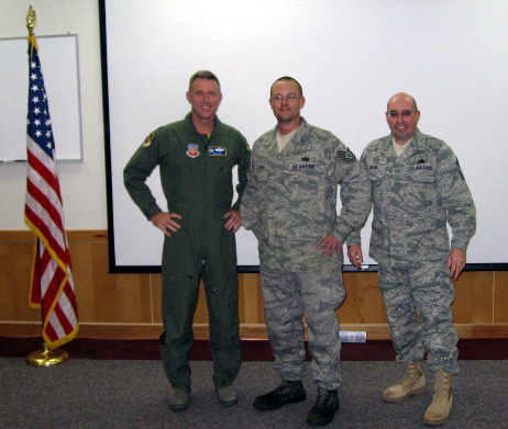 DYESS AIR FORCE BASE, Texas -- Staff. Sgt. Wesley Hilbrich, 7th Aircraft Maintenance Squadron, was promoted to technical sergeant Dec. 19 through the Stripes for Exceptional Performers program. Colonel Robert Gass (left), 7th Bomb Wing commander, and Command Chief Master Sgt. David Goldie (right) presented Sergeant Hilbrich (center) his new stripe. The Air Force Chief of Staff approves a very limited number (lesser of 422 stripes or 2 percent of projected WAPS promotions to grade E-5, E-6 and E-7) of allocations for a STEP promotion, according to the Military Professional Development Center. There are usually only two or three STEP allocations given to each wing per year, which commanders use to promote "exceptional" individuals to staff sergeant, technical sergeant, and master sergeant. (Courtesy photo)