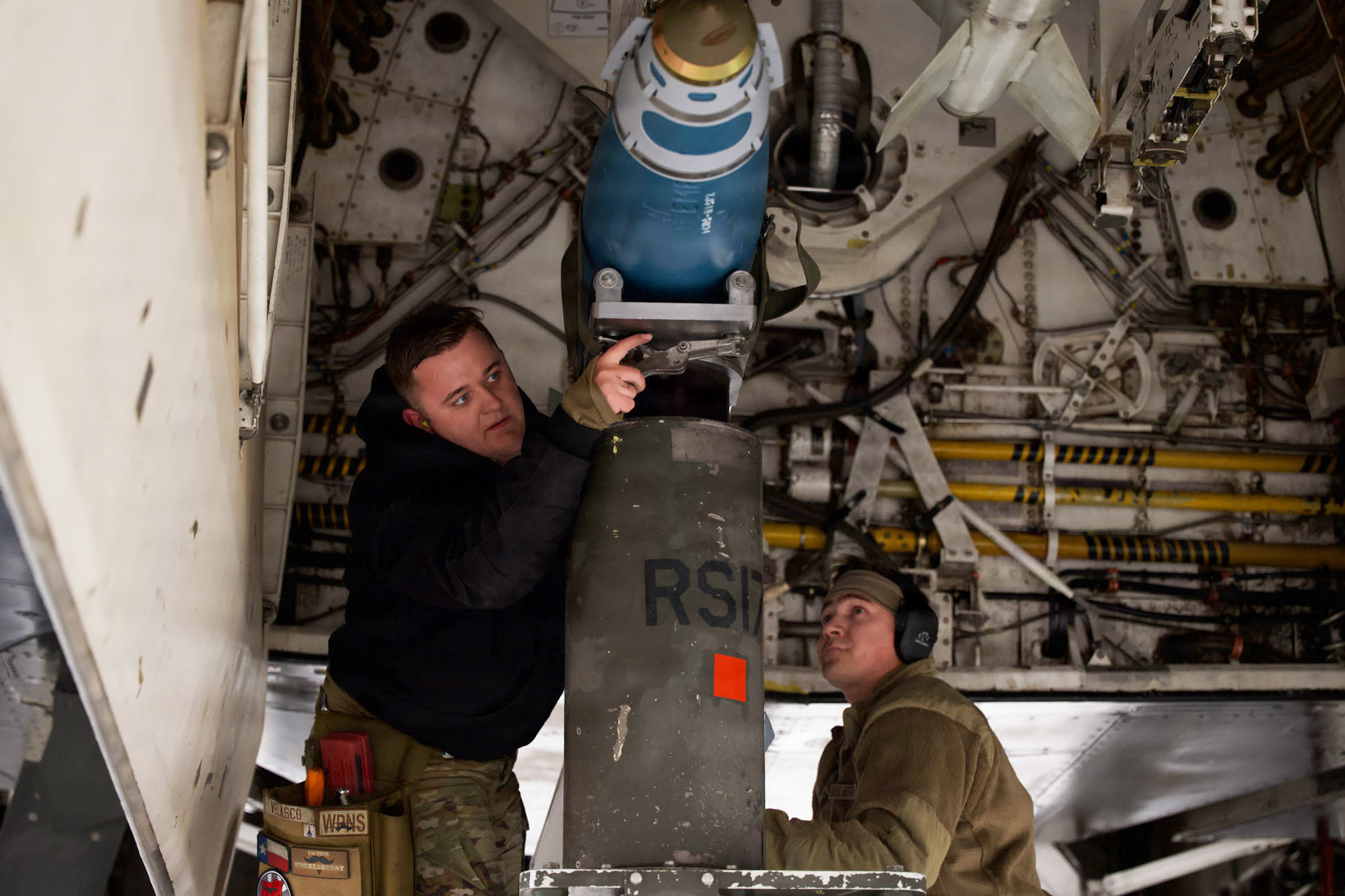 U.S. Air Force Master Sgt. Phillip Montano, 28th Bomber Generation Squadron weapons generation flight chief, right, and Staff Sgt. Abdiel Ruiz-Borres, 7th Maintenance Group lead crew team chief, review pre-weapons loading procedures during the annual Weapons Load Crew of the Year competition at Dyess Air Force Base, Texas, Dec. 4, 2025. The competition demonstrated the expertise and precision required for real-world missions. (U.S. Air Force photo by Senior Airman Emma Anderson)