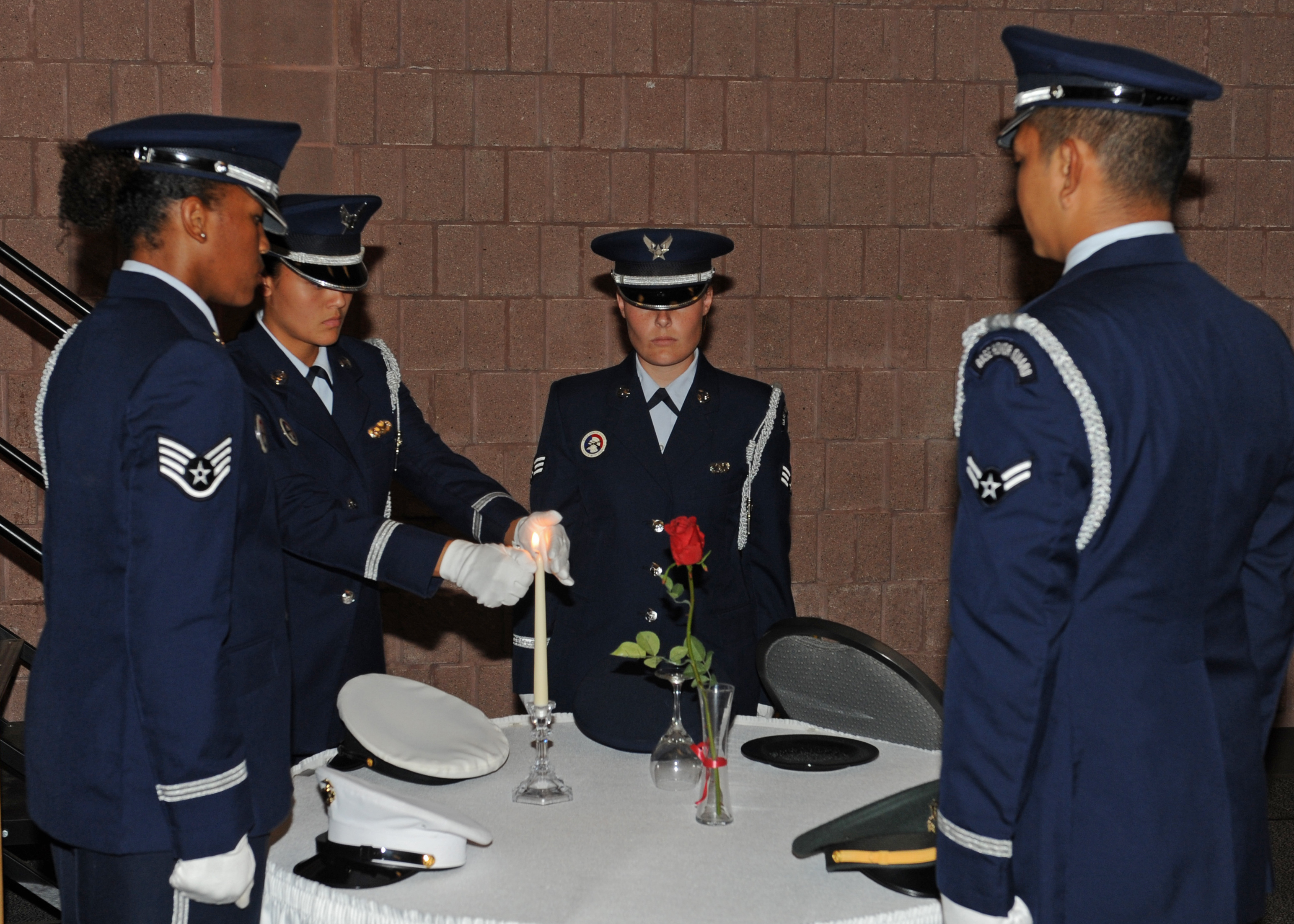 A Dyess Honor Guardsman lights the ceremonial Prisoner of War Missing in Action Candle during the annual Air Force Ball Sept. 14, 2012, at the Civic Center in Abilene, Texas. Dyess celebrated the Air Force’s 65th anniversary with the Air Force Ball. (U.S. Air Force photo by Airman 1st Class Peter Thompson/ Released)