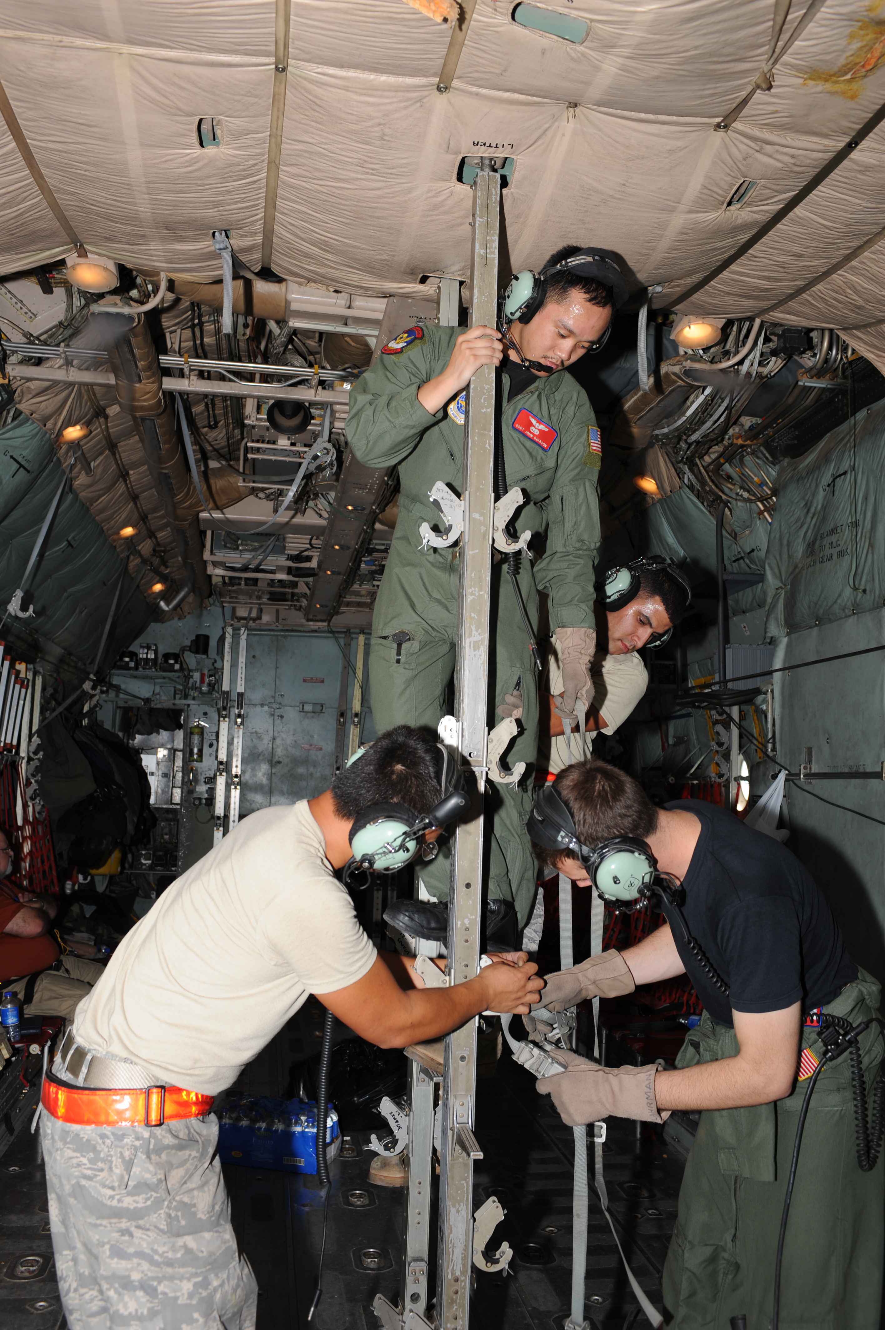 DYESS AIR FORCE BASE, Texas- Loadmasters and Crew Chiefs of the C-130 Hercules disconnect harnesses used by medical personnel to hold down equipment while in route back to Dyess AFB from Corpus Christi, Texas, Sept 11. After crew rest the Dyess AFB C-130 transported a Wright-Patterson AFB, Ohio, medical team from Little Rock Arkansas to Corpus Christi, Texas, to help with the evacuation of sick patients to Dallas Fort-Worth Hospitals. The Air Force and other military forces not only respond in support of war efforts abroad but also to threats on the home front including natural disasters. (U.S. Air Force photo/ Senior Airman Courtney Richardson)