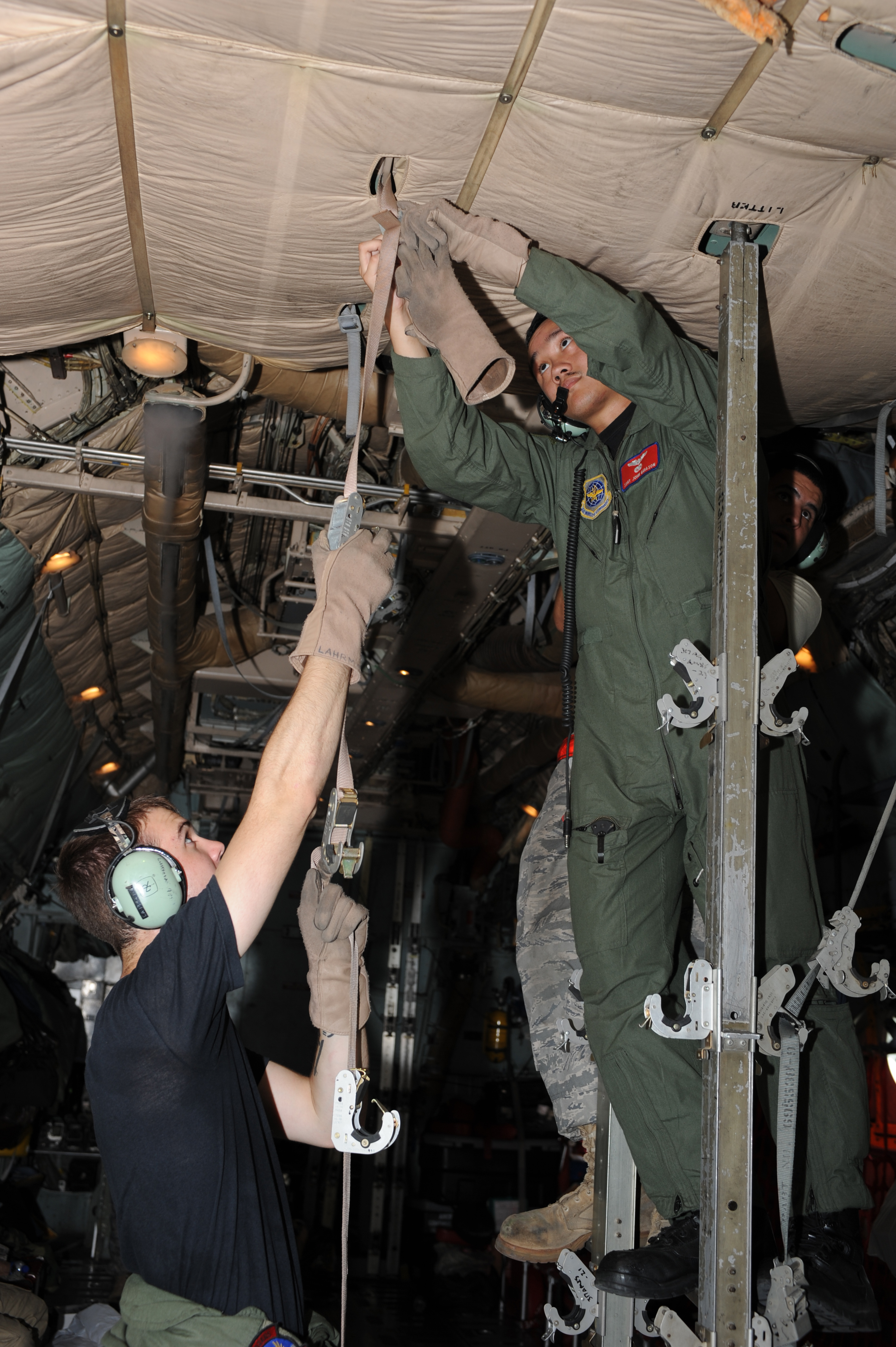 DYESS AIR FORCE BASE, Texas- Staff Sergeant John Quiason, C-130 loadmaster, disconnect harnesses from the ceiling of a C-130 while Senior Airman Michael Lahrman, also a C-130 loadmaster, holds the line steady while in route back to Dyess AFB from Corpus Christi, Texas, Sept. 11. The eight man crew was called out late Tuesday night to assist other bases with the Hurricane Ike evacuation of south Texas. The Air Force and other military forces not only respond in support of war efforts abroad but also to threats on the home front including natural disasters. (U.S. Air Force photo/ Senior Airman Courtney Richardson)