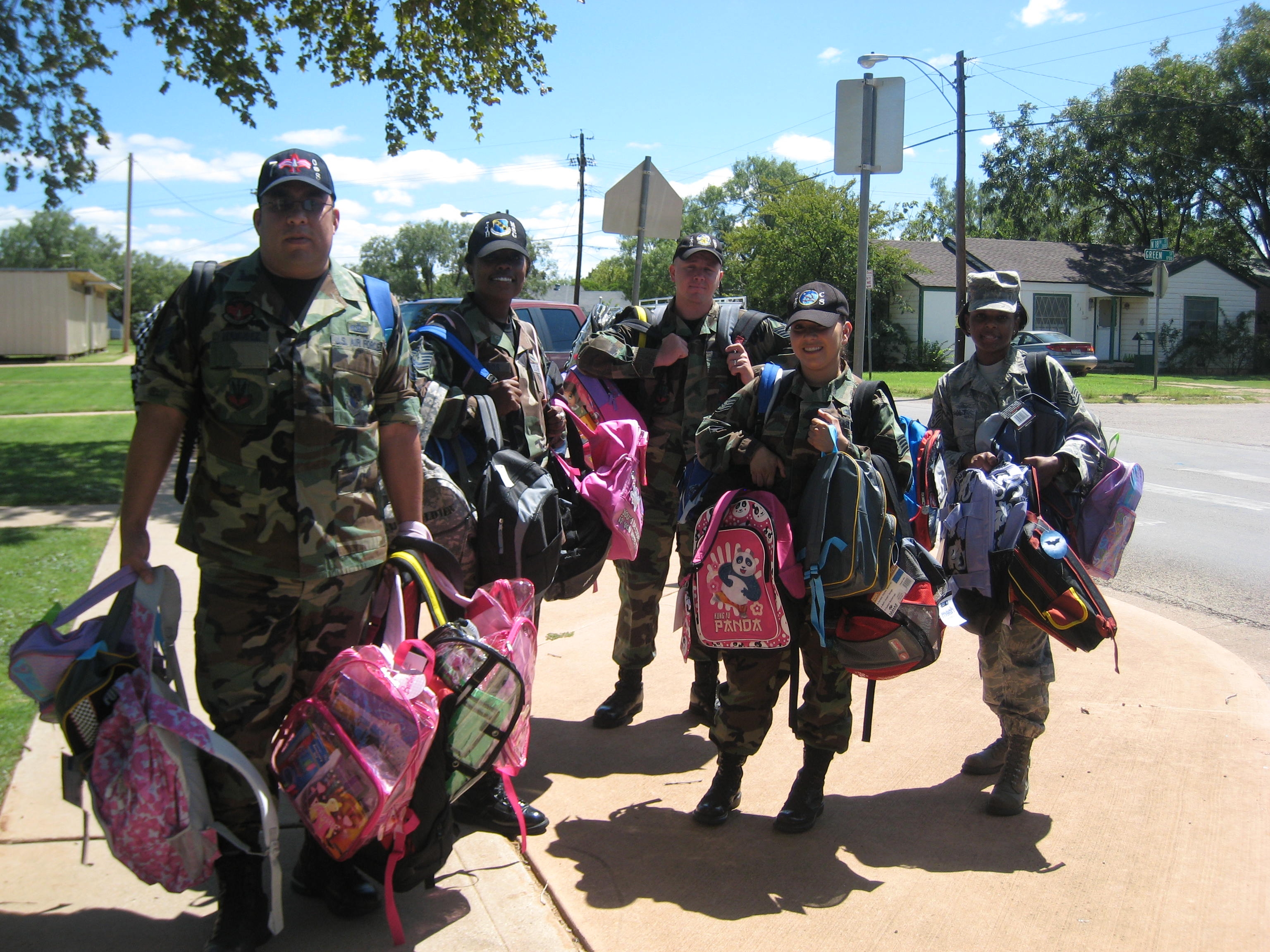 DYESS AIR FORCE BASE, Texas -- Members of the 56 Club deliver backpacks to Fannin Elementary School Sept. 4. Dyess 56 Club held a backpack and school supply drive Aug. 18 at the Base Exchange to give some Abilene Independent School District students a head start for the new school year. Volunteers collected 47 backpacks full of school supplies filled with everything from scissors and glue to notebooks and pencils, worth a total of $1,544. (Photo by Tech. Sgt. Yolanda Hands)