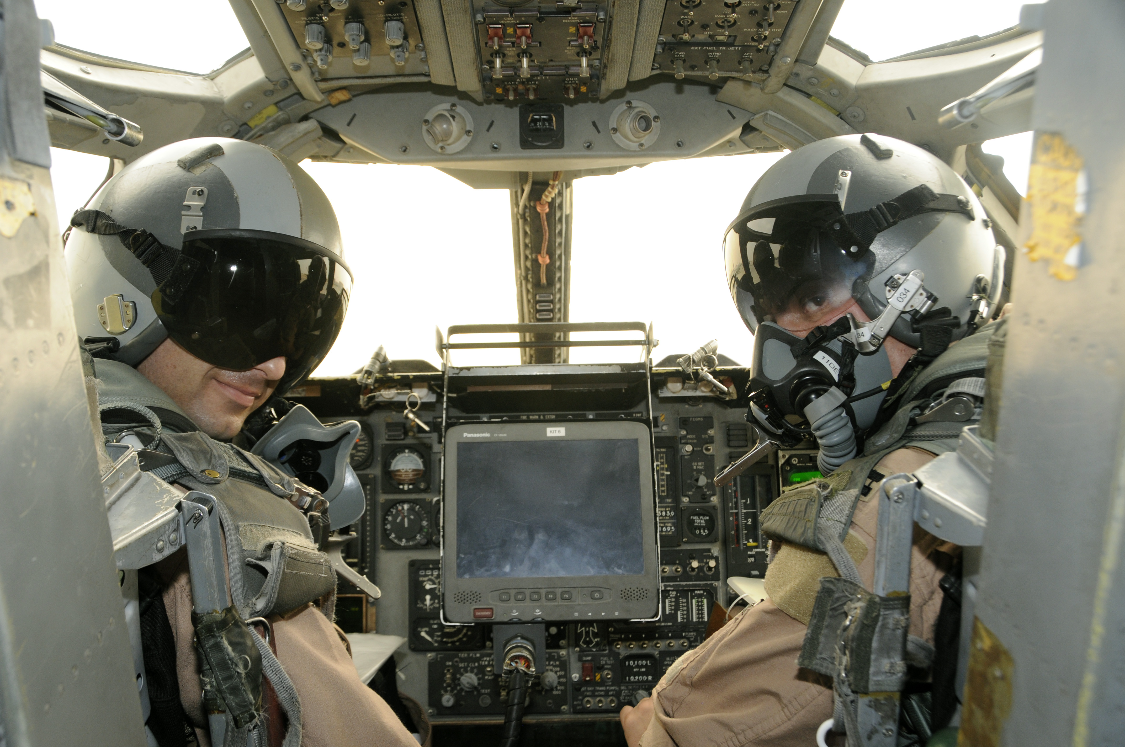 Maj. Jeff Cameron and Capt. Richard Hansen prepare for takeoff in support of Operation Enduring Freedom, at the 379th Air Expeditionary Wing in Southwest Asia, Nov. 19, 2013. Cameron is a B-1 pilot originally from Midland, Texas, and Hansen is a B-1 pilot originally from Lancaster, Calif., both are 9th Expeditionary Bomb Squadron pilots currently deployed from Dyess Air Force Base, Texas. (U.S. Air Force photo/Senior Airman Hannah Landeros)