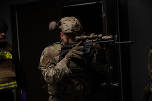 U.S. Airmen assigned to the 21st Air Task Force and 21st Combat Air Base Squadron practice shooting stances as part of Close Quarters Battle training during Joint Pacific Multinational Readiness Center 26-01 at Schofield Barracks, Hawaii, Nov. 6, 2025. These training events prepare the 21st ATF to