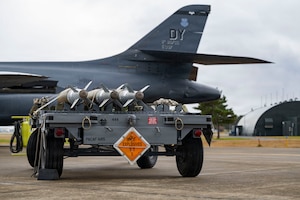 U.S. Air Force Airmen assigned to the 9th Expeditionary Bomb Squadron, loaded GBU-54 bombs during a bomber task force weapons load at Misawa Air Base, Japan, Nov. 10, 2025. Marking the first-ever B-1B Lancer munitions load in mainland Japan, the event underscored total force integration and enhanced